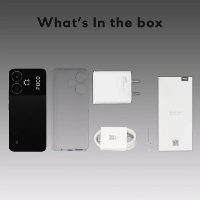 Handset, 33W Charger, USB Type-C Cable, Sim Eject Tool, Protective Case, Quick Start Guide, Warranty Card