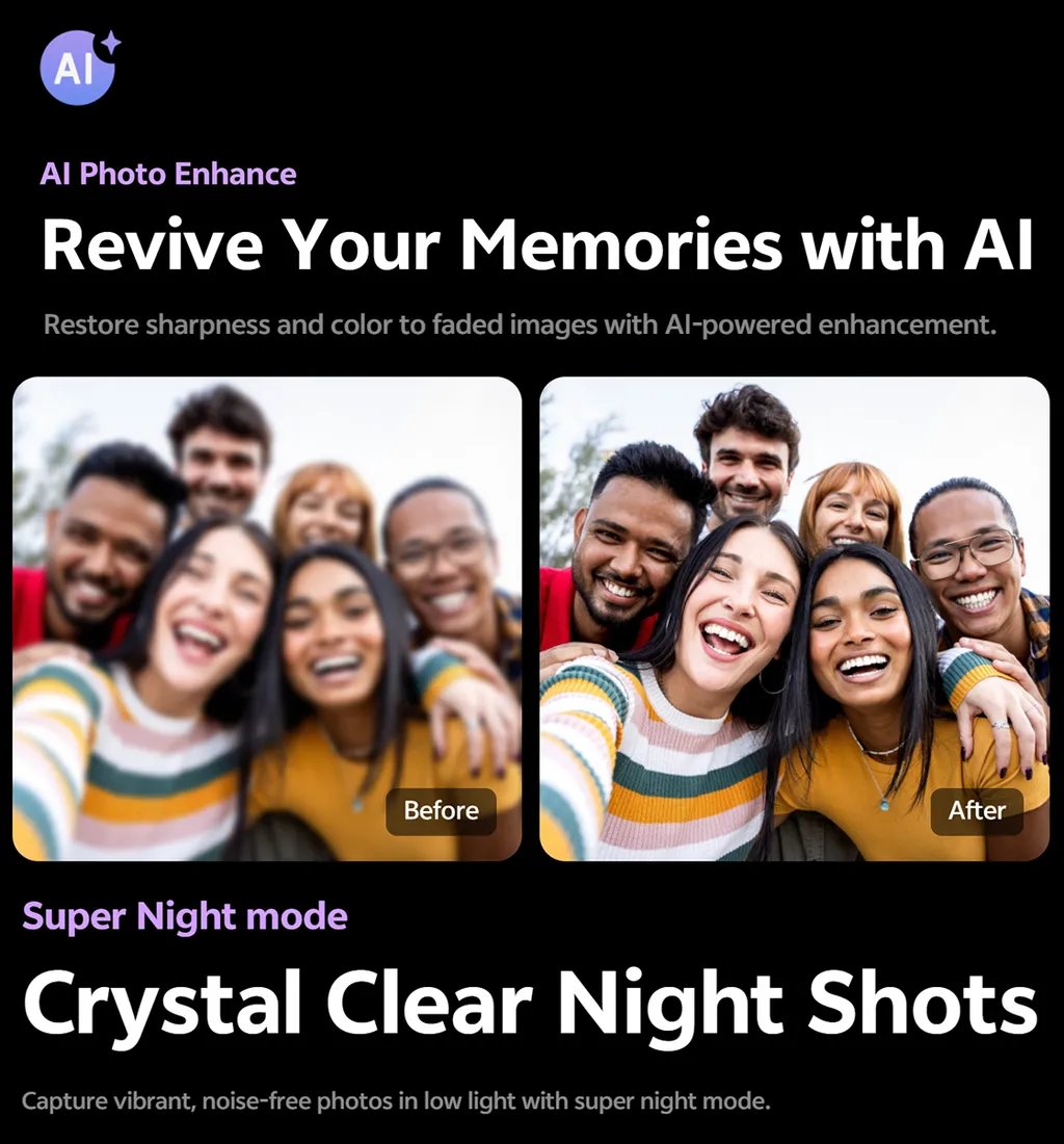 Dual Camera Setup: 50MP AI Main Camera (Autofocus Supported, f/1.8 Aperture) + 2MP Bokeh Camera (f/2.4 Aperture), Features: Night, Portrait, Photo, Video, 50MP, Pano, Documents, Slo-Mo, Timelapse, Pro, Live Photo